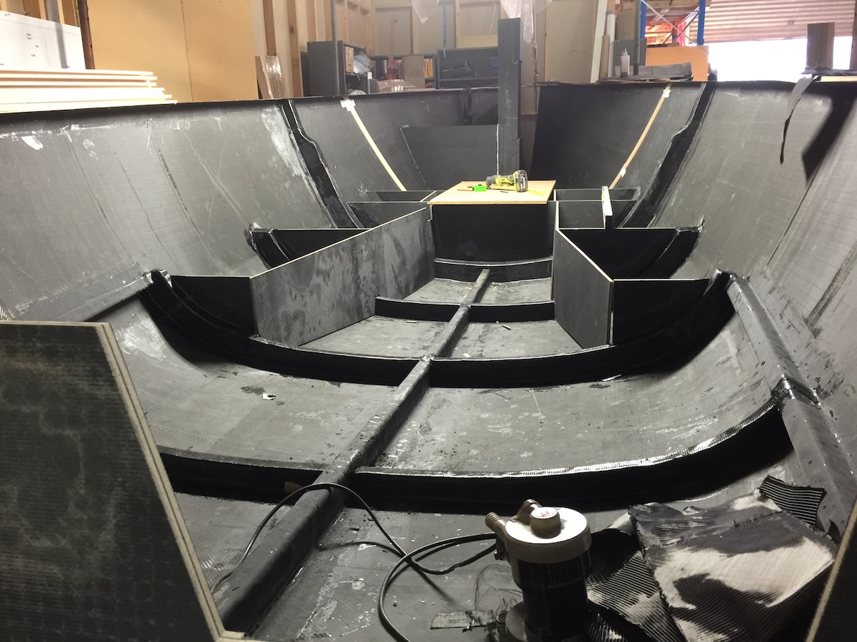 The next step was building a female hull setup where I shaped and created the foam core of the hull, then infused the inside lining, again with a layup variety of Carbon Cloths. The bulkheads and keel boxes were layered up during Winter inside my offices and then fitted to the female hull shell when the weather heated up. Once the inside components were fitted, the deck was lowered into position and attached. The last step of the actual build was the outside of the hull. The Hull/Deck were rolled, and the outside Carbon laminate was then layered up and again infused.